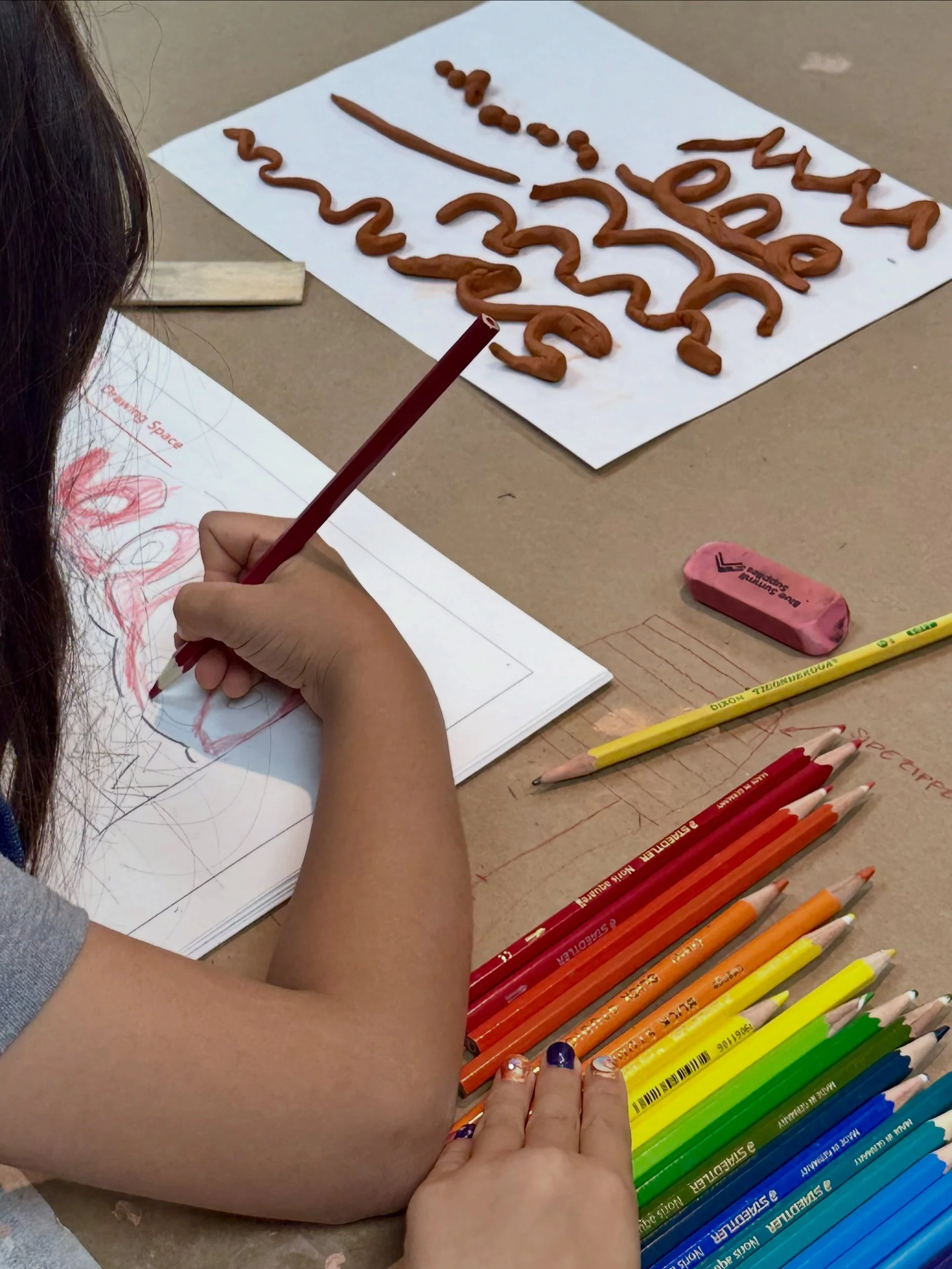 After working with clay, students transitioned to colored pencil sketching. Using their clay practice as inspiration, they created abstract line drawings on paper, thinking about how to organize space and create visual rhythm. These drawings will serve as the planning stage for next week’s final project, where they’ll return to clay and complete their compositions with acrylic paint and gel medium.